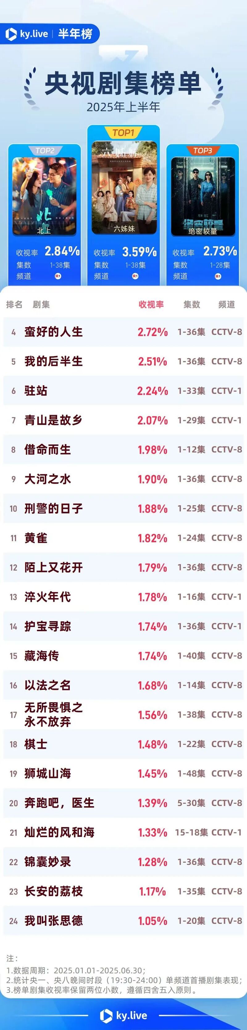 2025年上半年,央8的头部剧集已建立起显著的收视优势。《六姊妹》以3.59%的收视率领跑,《北上》《绝密较量》分别以2.84%、2.73%的收视率紧随其后,《蛮好的人生》也表现稳健,收视率达2.72%。