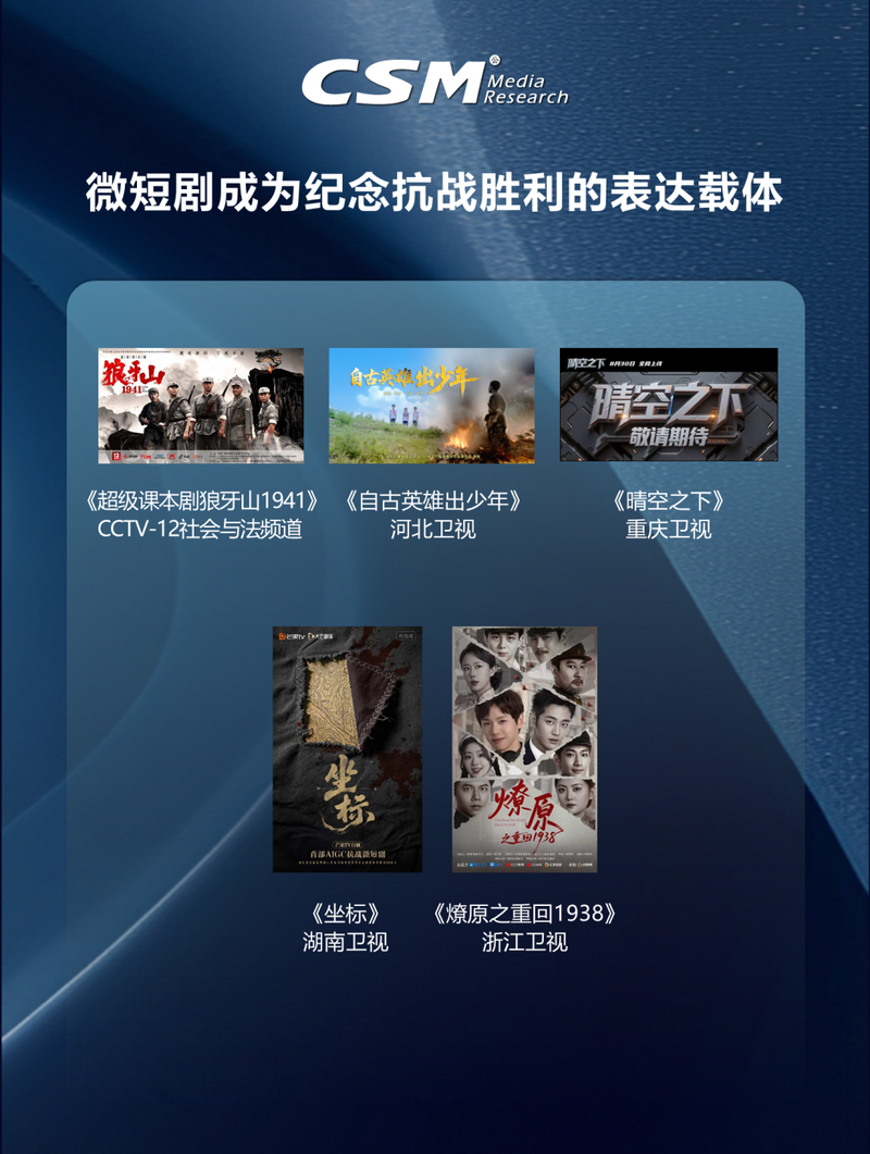 时值抗日战争胜利80周年,微短剧也成为纪念抗战胜利、弘扬红色文化的重要表达载体。多家广电机构发挥主流媒体的价值引导和资源整合等能力,围绕这一主题精心创作并在大屏端推出多部兼具历史厚度与时代温度的微短剧作品。如,中央台十二套推出了以1941年日军对晋察冀根据地实施的"秋季大扫荡"为历史背景的微短剧《超级课本剧狼牙山1941》,河北卫视播出了以河北抗战史上的真实小英雄或者经典文学形象为原型的微短剧《自古英雄出少年》,两部微短剧55岁以上观众占七成左右。湖南卫视播出了以1942年冀中平原抗日军民反"五一大扫荡"为背景的微短剧《坐标》,该剧吸引了许多年轻观众,15-44岁观众占比达51.9%。