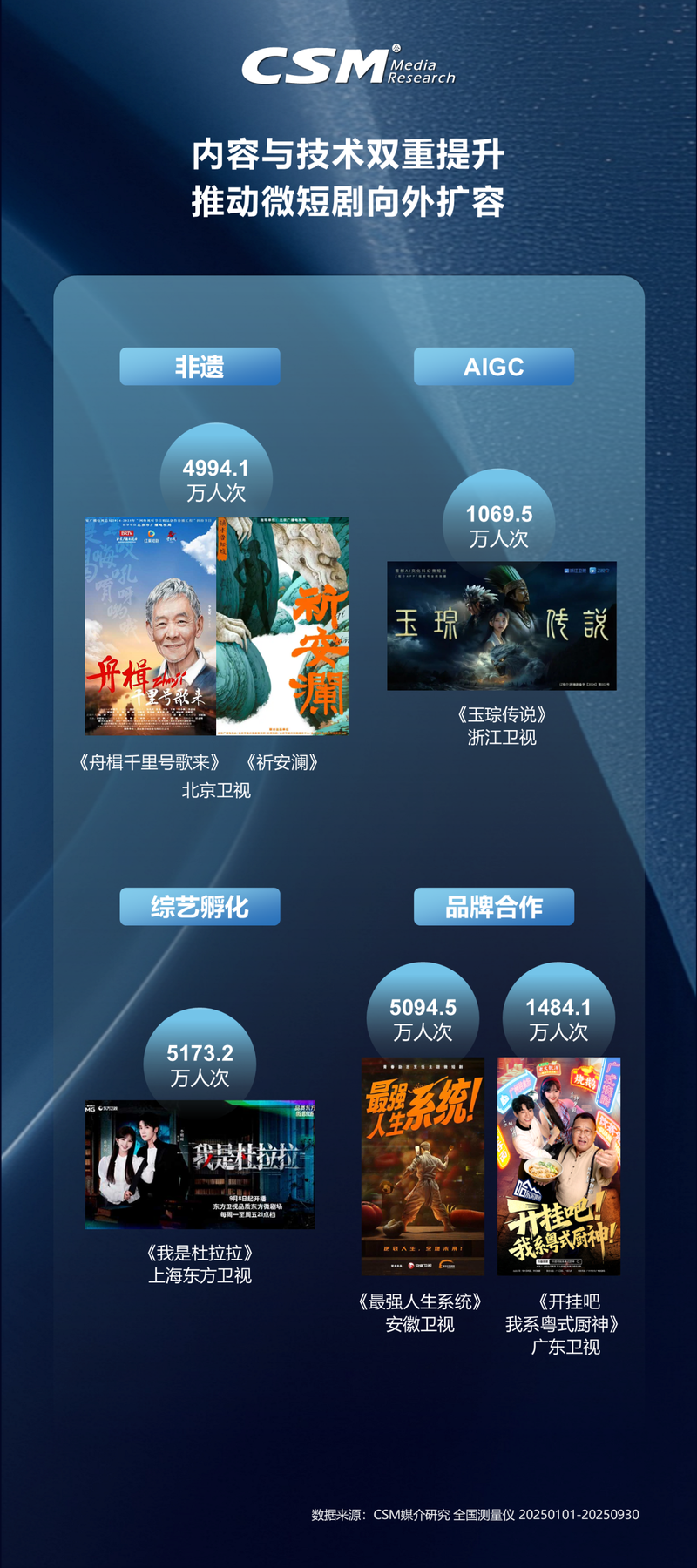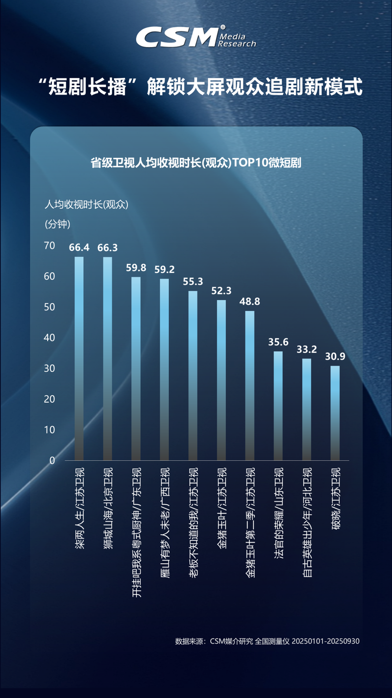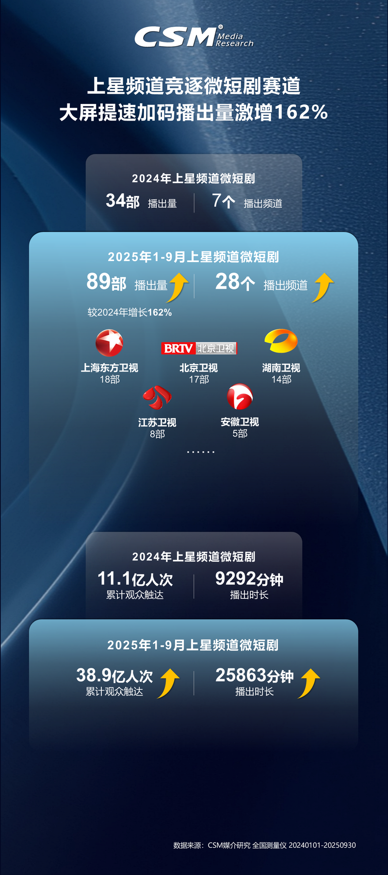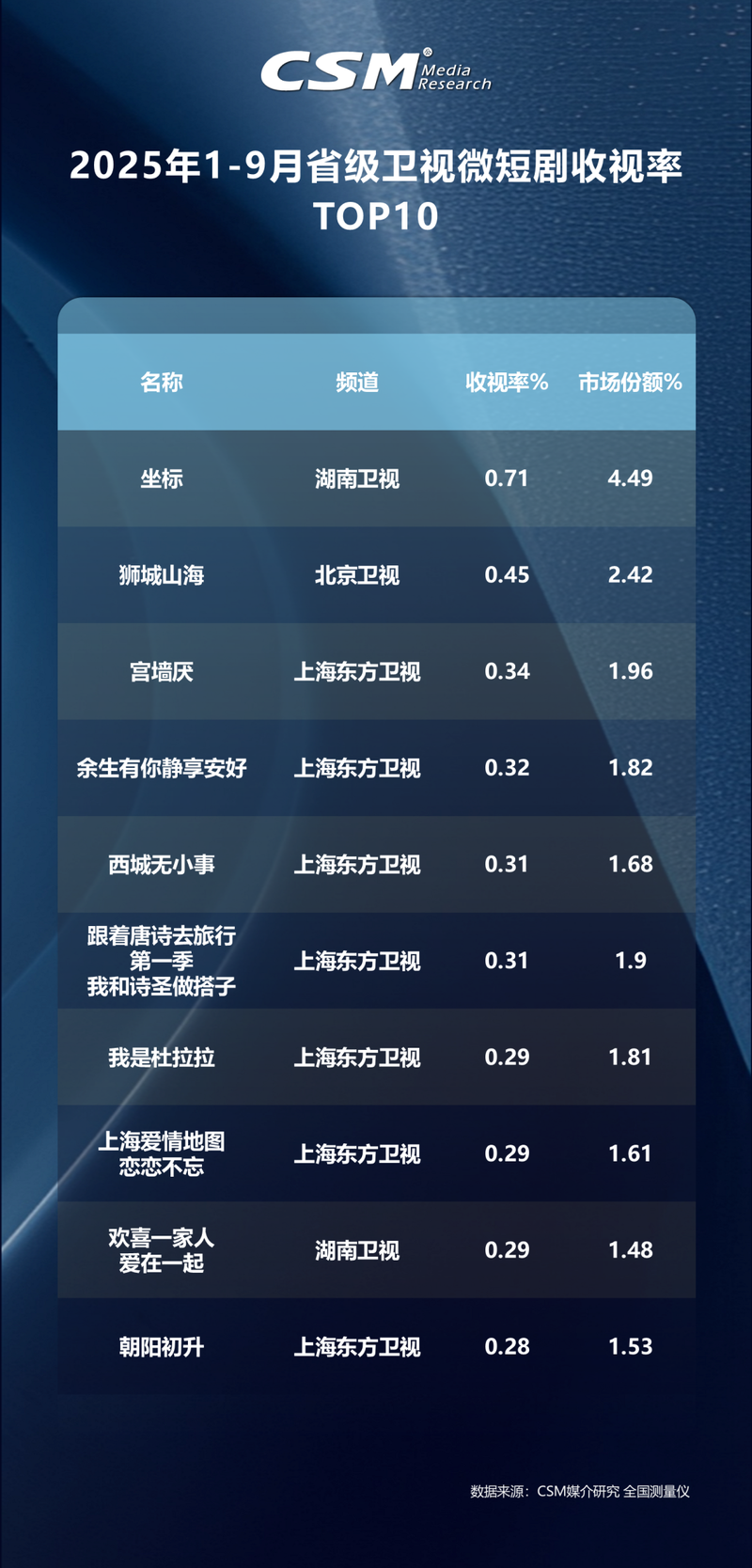 CSM全国测量仪数据显示,2025年1-9月省级卫视频道播出的微短剧中,湖南卫视“大芒剧场”9月1日推出的AIGC抗战微短剧《坐标》收视率达0.71%,荣登榜首;上海东方卫视“品质东方·微剧场”同样表现突出,其播出剧目在大屏微短剧首播收视率TOP10中揽获七席。