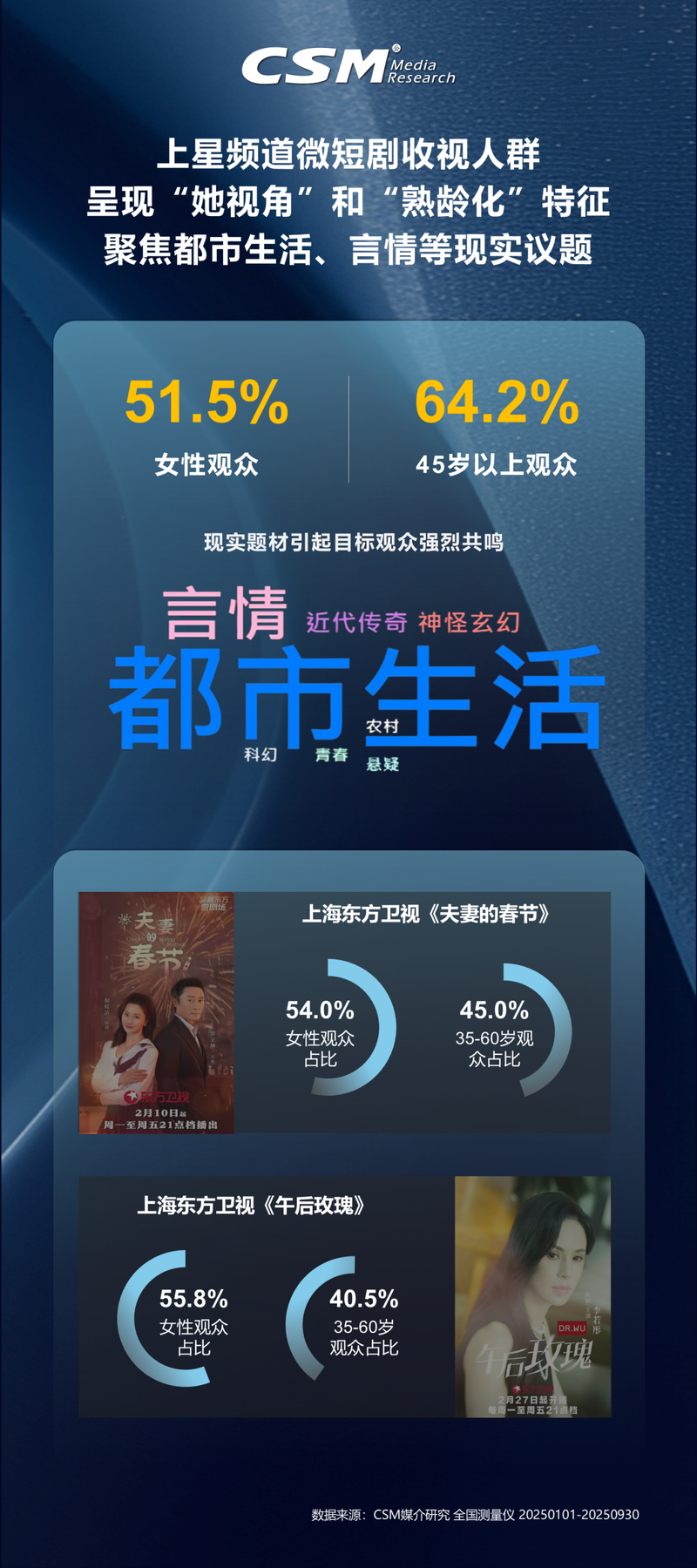 在题材方面,上星频道热播微短剧呈现出多元发展、精品化突出的特征。除近代传奇、神怪玄幻等传统类型外,作品更聚焦于言情、都市生活等现实议题,引发广泛情感共鸣。例如,上海东方卫视播出的《夫妻的春节》以一位长期在婚姻中处于被动地位的中年女性视角,探讨夫妻关系与自我觉醒,女性观众占比达54%,35-60岁观众达45.0%;《午后玫瑰》则关注当代女性职场议题,引发大屏观众强烈共鸣,女性观众占比55.8%,35-60岁观众也超过四成。