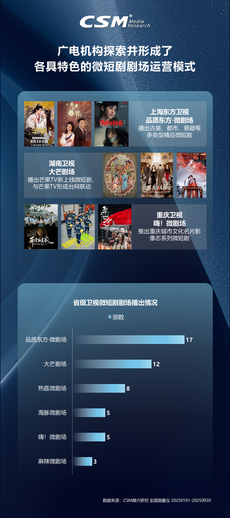 2025年1-9月,上海东方卫视、湖南卫视、江苏卫视、安徽卫视、重庆卫视与四川卫视等频道积极推动微短剧剧场化运营,共播出50部作品,并在实践中逐步形成各具特色的发展模式。