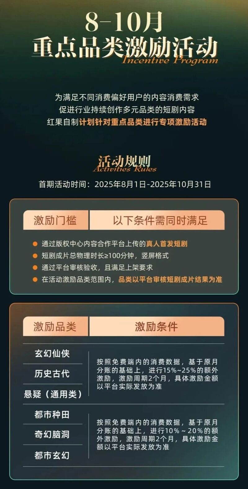 值得一提的是,2025年8月至10月期间,为了满足不同消费偏好用户的需求,促进行业持续创作多元品质的短剧内容,红果短剧创作服务平台针对部分重点品类开展专项激励活动,覆盖玄幻仙侠、历史古代、悬疑、都市种田、奇幻脑洞、都市玄幻六大方向。根据品类不同,在原有分账基础上增加10%至25%的激励,力度明显。