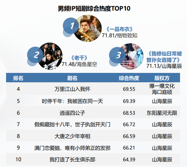 从男频IP短剧综合热度TOP10来看,《一品布衣》位居榜首,《老千》紧随其后,山海星辰有《我修仙日常被曾孙女直播了》《时停千年,我被困在同一天》等5部作品上榜,堪称男频IP改编赛道的佼佼者。