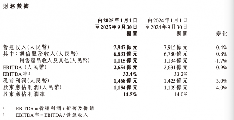 期内,中国移动实现营运收入为7947亿元,同比增长0.4%;其中,通信服务收入为6831亿元,同比增长0.8%;EBITDA为2654亿元,同比增长0.9%;股东应占利润为1154亿元,同比增长4%。