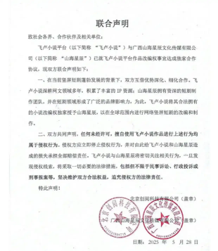 2025年5月,短剧头部平台山海星辰与网文平台飞卢小说达成独家合作,前者成功获取飞卢全量作品的改编权。