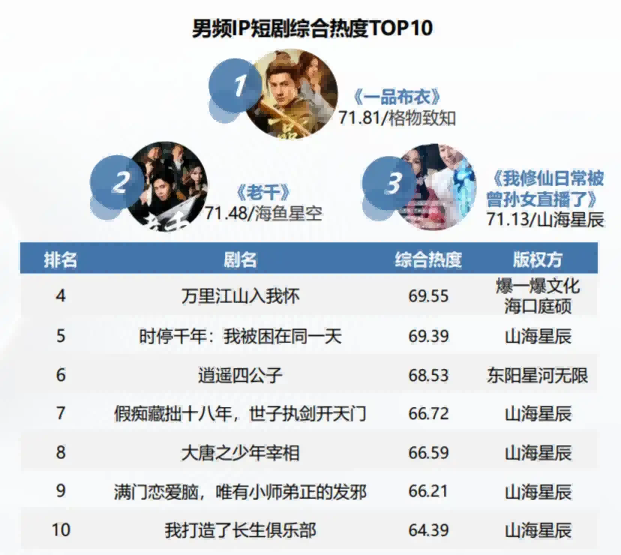 从男频IP短剧综合热度TOP10来看,《一品布衣》位居榜首,《老千》紧随其后,山海星辰有《我修仙日常被曾孙女直播了》《时停千年,我被困在同一天》等5部作品上榜,堪称男频IP改编赛道的佼佼者。