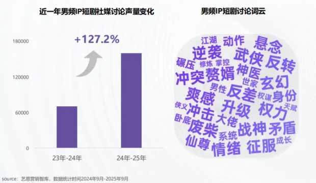 反观男频IP短剧,正成为潜力显著的蓝海赛道。近一年,男频IP短剧的社媒讨论声量同比增长127%,已成为短剧市场新的增长引擎。