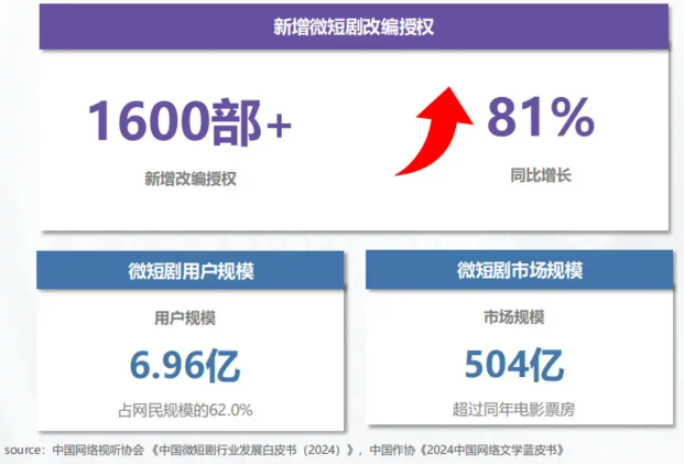 根据艺恩发布的《2025中国「网文IP」短剧开发价值洞察报告》,网文IP已成为短剧内容的“压舱石”。近两年,网文IP的微短剧改编授权呈爆发式增长,2024年新增授权量超1600部,同比激增81%,现存总量已达3700余部。