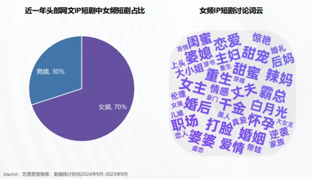 艺恩报告显示,近一年头部网文IP短剧中,女频短剧占比高达70%,男频仅占30%。女频IP短剧已步入红海竞争阶段,成为行业必争领域。