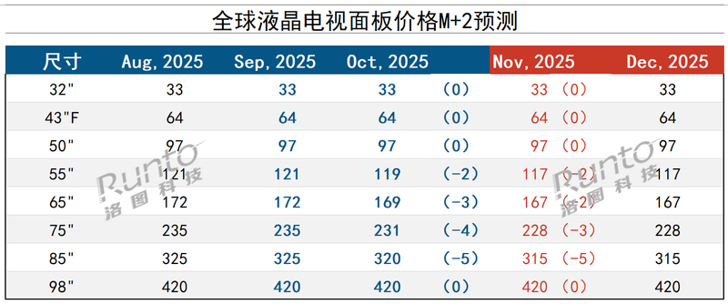 --核心观点:①面板厂的运营越来越精细化,2025年至今,面板价格没有发生较大幅度或者较长周期的震荡。大厂的电视面板业务利润截至9月份已经达到40-50亿以上,基本实现预期。②临近年底,面板厂和大型客户之间将开始rebate的谈判,整机客户的面板综合采购成本会有一定程度的降低。③一般的,第一季度的供需状况均比较乐观。若今年第四季度跌幅较深,进入2026年之后,面板厂需要爬坑;若跌幅浅尝辄止,则2026年上半年利润可轻松保障。洛图科技(RUNTO)认为,第四季度的跌幅应比较有限,一方面2026年世界杯的需求因关税风波而前置,并陆续释放;另一方面,年底将是头部品牌争夺市场份额的最后时间窗口,采购需求理应刚性;第三,不排除面板厂再将稼动率下调15%。