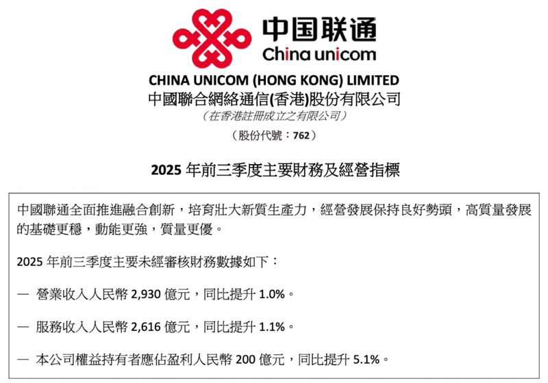 报告期内,中国联通实现营业收入人民币2930亿元,同比提升1.0%,其中服务收入为2616亿元,同比提升1.1%。税前利润人民币247亿元,本公司权益持有者应占盈利人民币200亿元,同比提升5.1%。