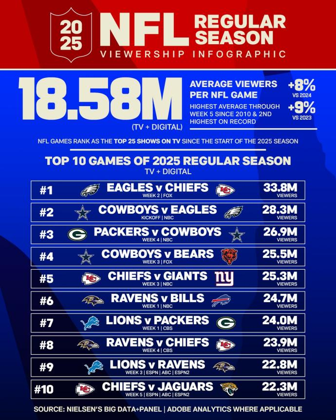 随着电视和流媒体机构为NFL转播权支付创纪录的价格,这些大赌注正在以创纪录的收视率获得回报。近期NFL官方在X平台上的一篇帖子中称,NFL每场比赛的平均观众人数为1858万,这是自2010年以来第五周的最高平均收视率。据NFL联盟报道,这也是有记录以来第二高的平均值。这一数据与2024年相比增长8%,与2023年相比增长9%。以下是前10名赛事的收视率。