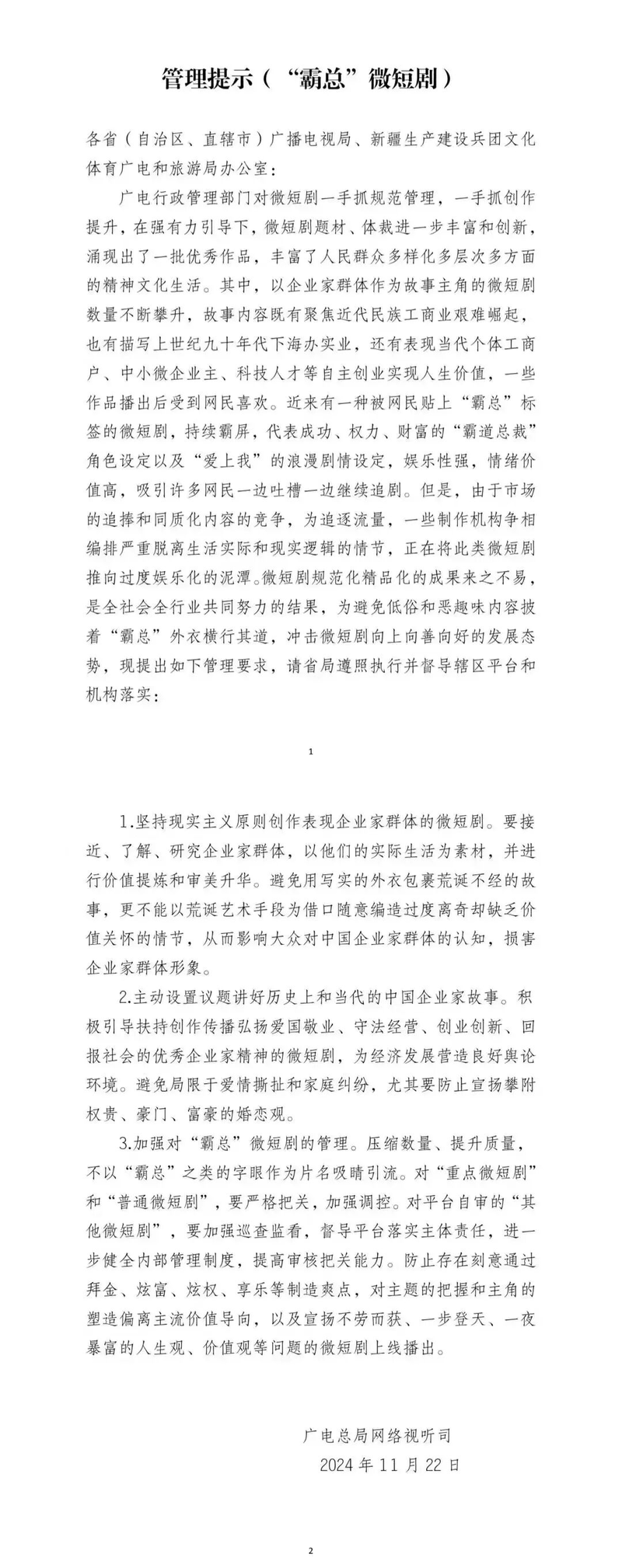 2024年11月,广电总局网络视听司发布《管理提示(“霸总”微短剧)》。