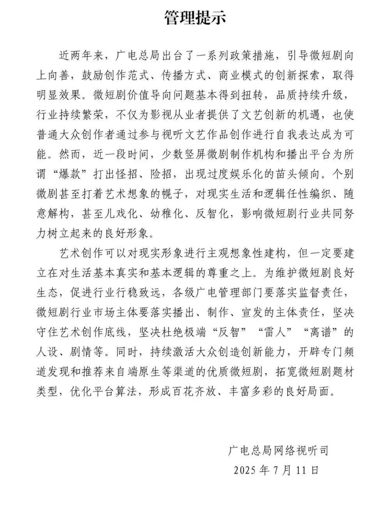 2025年7月11日,广电总局网络视听司发布《管理提示》。