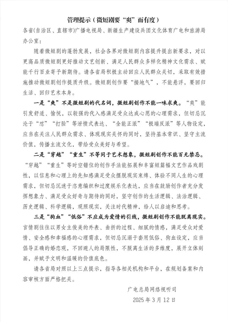 2025年3月,为推动微短剧提质升级,广电总局网络视听司再度发布《管理提示(微短剧要“爽”而有度)》。