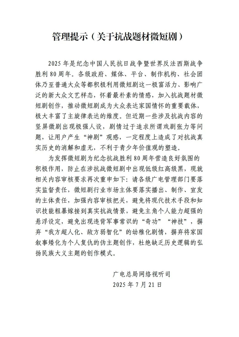 2025年7月21日,国家广电总局网络视听司发布《关于抗战题材微短剧的管理提示》,要求微短剧行业市场主体要落实播出、制作、宣发的主体责任,加强内容审核把关,杜绝抗战题材微短剧悬浮设定、幼稚剧情、伪主题创作等不正之风。