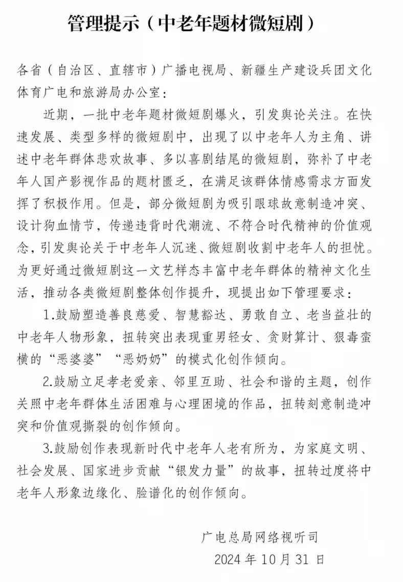 2024年10月,广电总局网络视听司发布《中老年题材微短剧管理提示》。