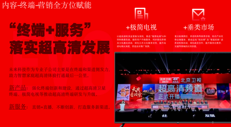 未来科技通过创新内容+产品+服务,以“构建新型视听服务体系”为核心目标,为中国广电新疆公司提供强有力支撑,通过打造终端和内容侧的新产品,并加强渠道和新服务升级,助力中国广电新疆公司实现全疆超高清落地的目标。