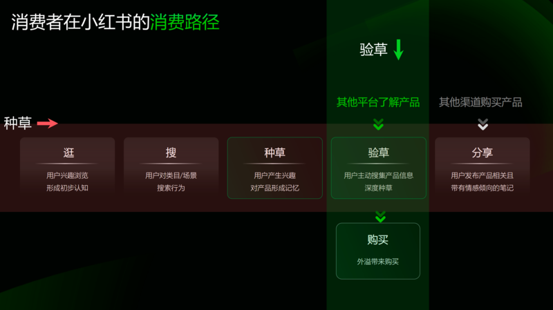 种草是传统路径:用户经历“逛、搜、种草、分享”的完整链路。验草则是关键的新行为:用户在其他平台(如大屏)看到广告后,会回到小红书进行验证,查看真实用户的评价,最终决定是否消费。验草这一行为,是跨屏联动中最关键的消费者行为之一。
