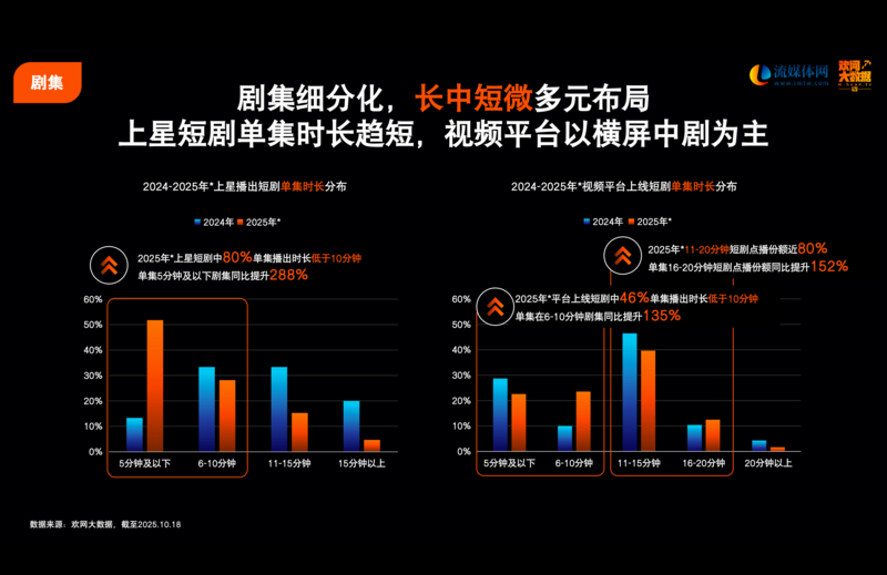 长剧已进入提质减量越来越稳定成熟阶段,短剧则持续向精品化、类型化多线发展。剧集在电视台端和视频平台端的体量均大幅增长,其中短剧增长显著:以30分钟为界,台端短剧占比超50%,视频平台侧超60%,推进整体市场剧集部数大幅增长。