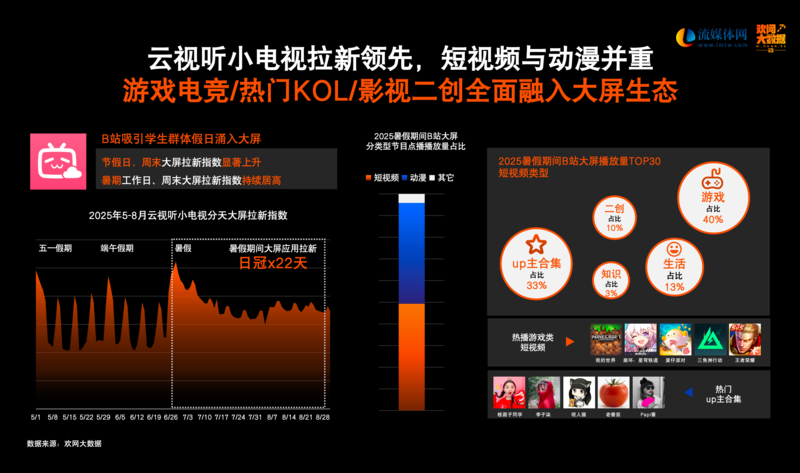 动漫板块中,B站表现突出,大屏应用场景暑期数据中,随着学生潮涌入,云视听小电视在暑假拉新提升显著。主要内容点播类型为短视频和动漫,进一步拆分短视频可见,UP主合集、游戏生活等年轻态内容在大屏上可以有良好播放表现。