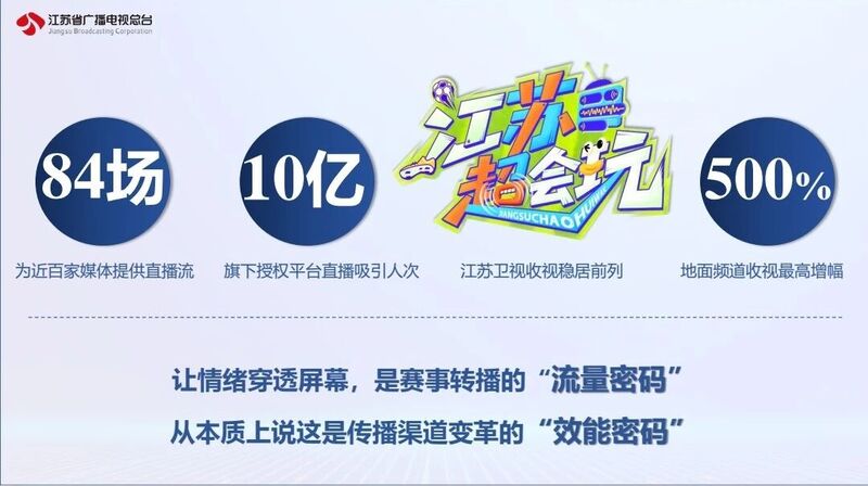 截至目前,江苏台为近百家媒体提供了84场直播流,旗下授权平台累计超10亿人次观看,江苏卫视特别节目《江苏超会玩》收视稳居前列,地面频道收视最高增幅达550%。这组数据印证:让情绪穿透屏幕,是赛事转播的“流量密码”,从本质上说,这是传播渠道变革的“效能密码”: