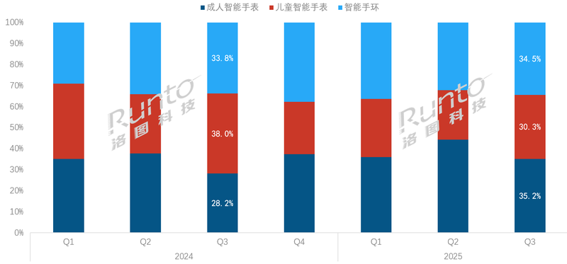 根据洛图科技(RUNTO)线上监测数据显示,2025年第三季度,在传统主流电商平台上,成人智能手表、儿童智能手表、智能手环的销量占比分别为35.2%、30.3%和34.5%。