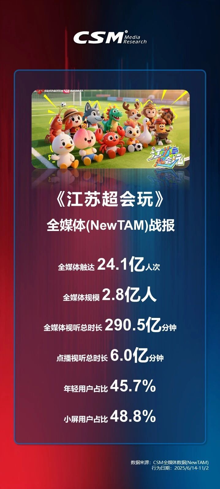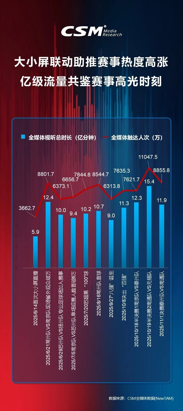11月1日,随着泰州队夺冠,历时半年,85场比赛的2025江苏省城市足球联赛(简称“苏超”)在南京奥林匹克中心体育场圆满落幕。首届“苏超”联赛社会热度空前,已然成为一场现象级全民足球盛会。江苏省广播电视总台依托其全媒体传播矩阵,高规格要求、全维度部署“苏超”赛事传播。其中,江苏卫视等频道与“ai荔枝”、荔枝新闻等客户端同步直播赛事,实现大小屏联动,全面覆盖电视与网络观赛场景,通过打造“苏超”视觉盛宴,以创新实践为大型区域体育赛事传播提供了“江苏样板”。本文使用CSM全媒体(NewTAM)、融媒等数据,聚焦江苏广电在“苏超”赛事中的全媒体传播效果。
