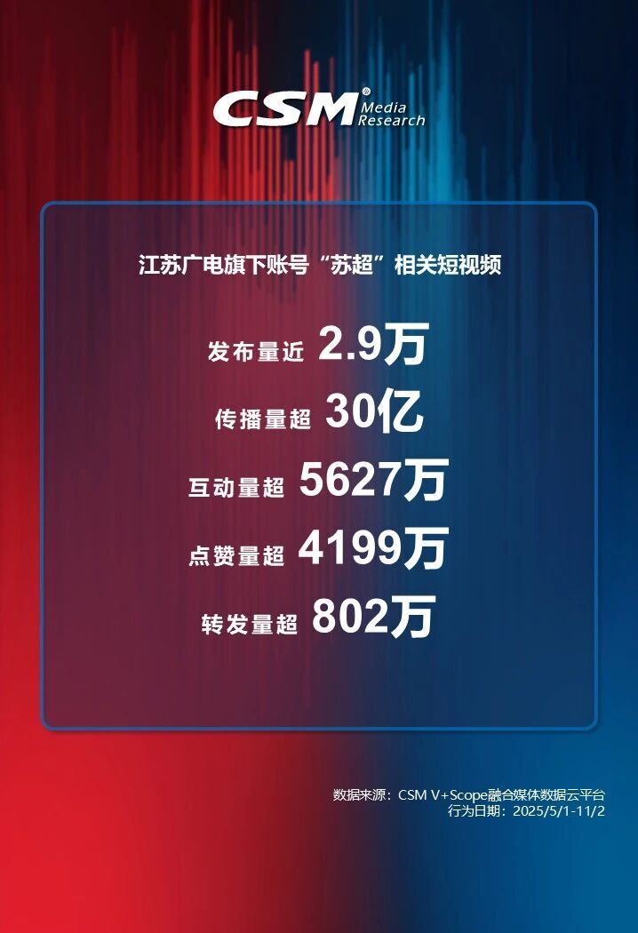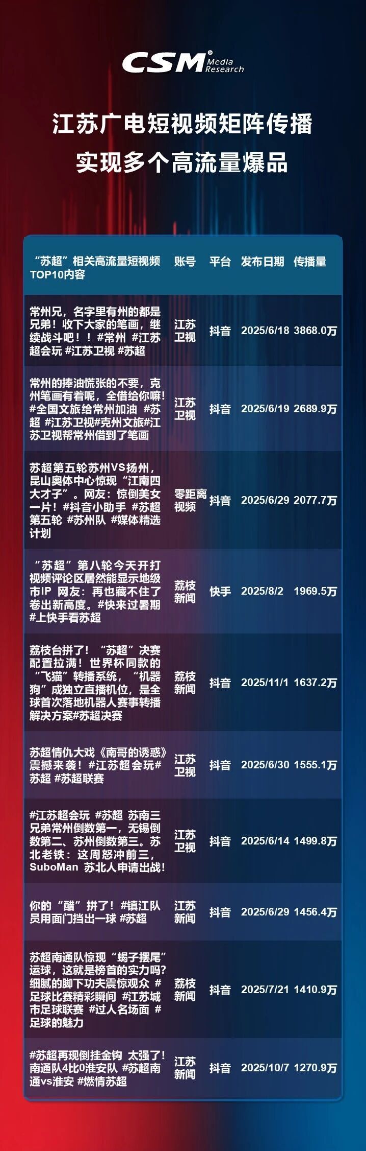 从绿茵赛事到全民共享的文化嘉年华,“苏超”依托“全民参与、文旅融合、大小屏联动”等的独特模式,已成为展现江苏精气神、激活内需消费的金名片。江苏广电凭借专业赛事转播、丰富特色节目及全网互动宣传等,深入挖掘“苏超”背后的长远社会效应,通过“转播”到“传播”的创新性跨越,助力“苏超”成为全民高度关注、并享誉全国的顶级赛事IP。首届赛事的圆满成功,无疑让人们对下一届“苏超”的精彩篇章及江苏省广播电视总台在未来“苏超”传播宣传中的系列探索举措更加充满期待!