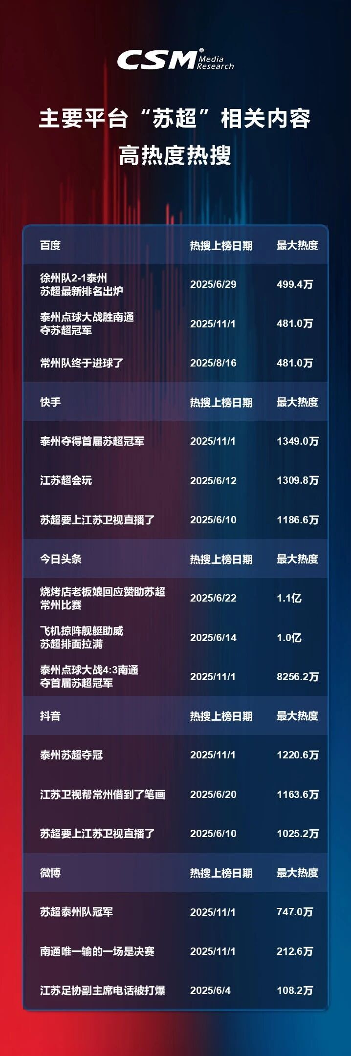 “苏超”凭借竞技体育的戏剧性与草根叙事的共鸣感屡屡登上热搜,“苏超”决赛相关内容也登上了各大平台热搜榜前列,其中如今日头条平台#泰州点球大战4:3南通 夺首届苏超冠军 最大热度达8256.2万;此外,#常州队终于进球了 的励志逆袭、#飞机掠阵舰艇助威 苏超排面拉满 的震撼场面等系列“苏超”相关热搜同样引发了全民的广泛关注与讨论。
