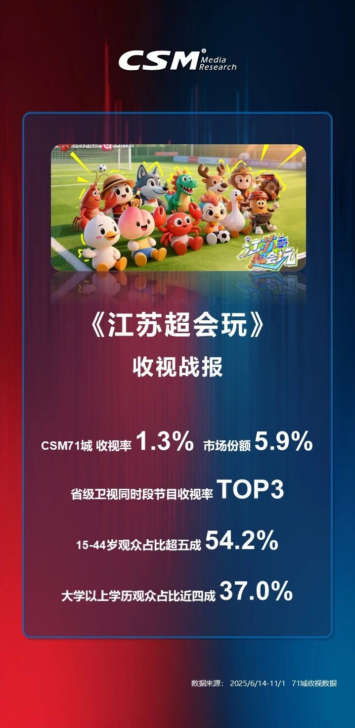 6月14日,伴随着第四轮“苏超”的战火重燃,江苏卫视首次联合“ai荔枝”打造《江苏超会玩》特别直播节目。节目以“轻竞技+强娱乐”模式激活全民观赛热潮,主持人李响坐镇演播室,邀请孟非、黄健翔等作为嘉宾,以他们的视角展开既专业又轻松、有趣的话题讨论,节目直播期间,观众可以通过“ai荔枝”客户端发弹幕并实时呈现在大屏上,并且还可以进入多个互动板块留言讨论或吐槽。同时,节目创新玩梗,制作多支“苏超”爆款短片,联动江苏省内及全国各地文旅部门共同开展宣推活动,“苏超”的热梗、新话题也实时被节目捕捉和呈现,形成线上线下的讨论场。《江苏超会玩》赛事播出期间在CSM71城中以1.3%收视率、5.9%收视份额居省级卫视同时段第三;主要观众构成方面,男性比例稍高于女性(男性:51.3%,女性:48.7%),15-44岁观众为54.2%,大学以上高学历人群近四成达37.0%。
