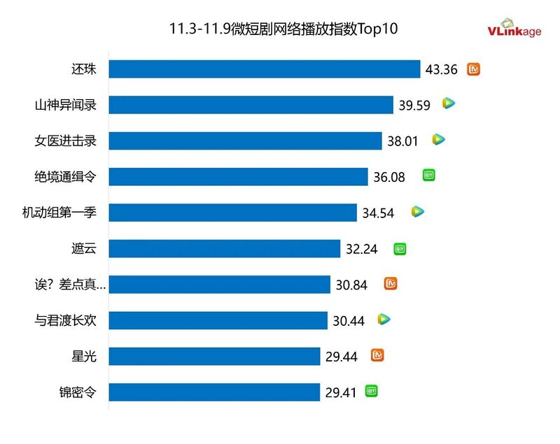 下图为上周微短剧网播指数Top10。热度最高的作品为上周新剧《还珠》,该剧是上周唯一一部网播指数40+的作品。同为新剧的《山神异闻录》也表现不错,网播指数直逼40。