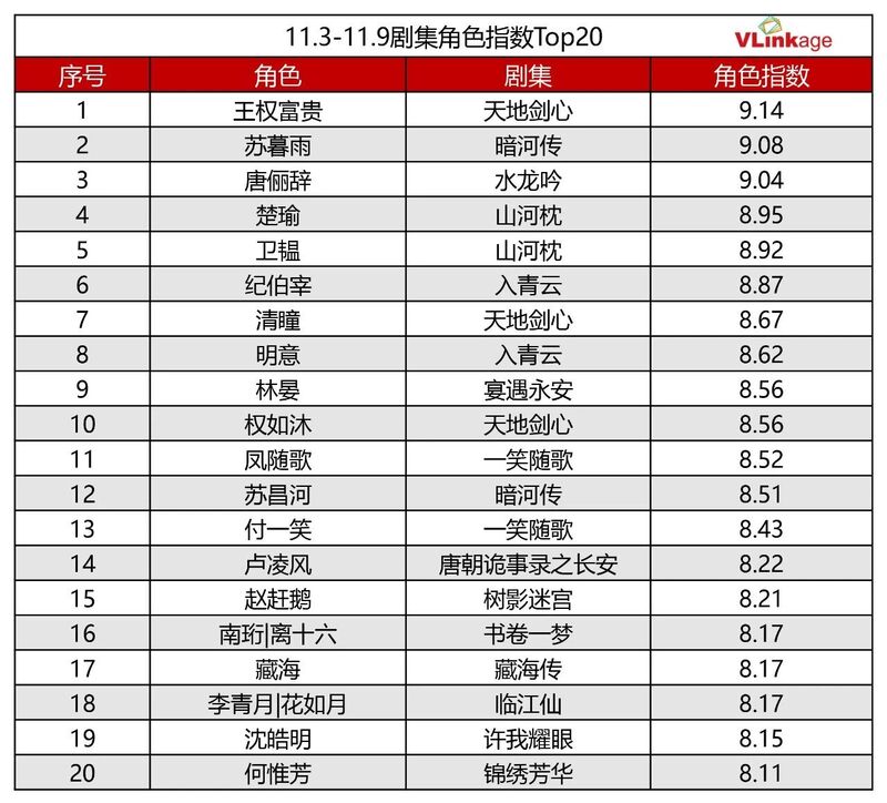 下图为上周剧集角色Top20,观众认知度最高的角色分别有《天地剑心》男主王权富贵,《暗河传》男主苏暮雨和《水龙吟》男主唐俪辞。剧集的高热度,角色的高辨识度,以及演员本人的号召力,都是这三位男主有着高人气的原因。