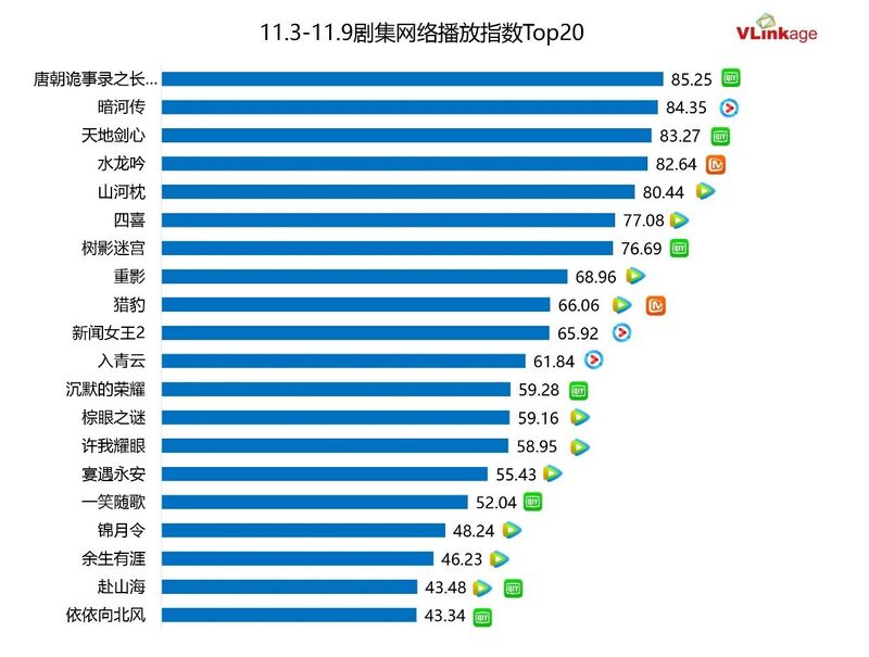 下图为上周剧集网播指数Top20,有5部作品网播指数在80+量级。其中热度最高的为上周新开播的古装悬疑剧《唐朝诡事录之长安》,该剧首周网播指数高达85+。古偶剧《暗河传》《天地剑心》《水龙吟》《山河枕》同样热度表现优异。这6部古装剧撑起了上周的大盘市场。