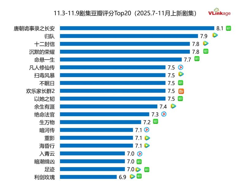 下图为上周剧集豆瓣评分Top20,《唐朝诡事录之长安》上线三天豆瓣开分8.1分,成为今年下半年唯一一部豆瓣评分8分+的作品,显然,这部作品没有辜负观众期待。该系列的前两部作品同样有着高满意度,豆瓣评分均在8分+。