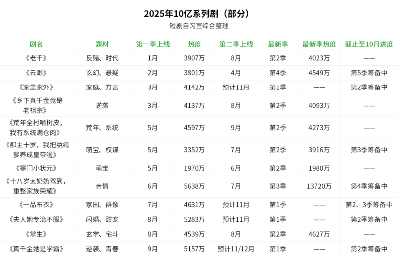 2025年开始,10亿短剧俱乐部中,频频出现系列短剧的身影,甚至细分出情景剧、单元剧、续集短剧、姊妹短剧......通通播放量涨势喜人,“拍一部换一个本”仿佛已成为旧时代的产物。