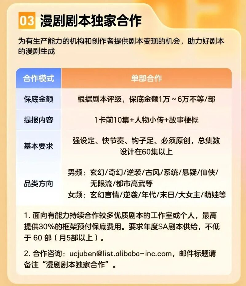 合作模式:UC故事库提供了超7万部UC原创网文IP,覆盖中篇、短篇、网文的超30个品类方向;改编类型不限,含小说漫、沙雕漫、动态漫、AIGC、漫剧等;分发渠道不限,成品同步首发上线至大鱼号创作平台,集团内多渠道分发;版权归UC所有。(三)漫剧剧本独家合作该模式,主要为有生产能力的机构和创作者,提供剧本变现的机会,助力好剧本的漫剧生成。
