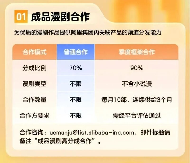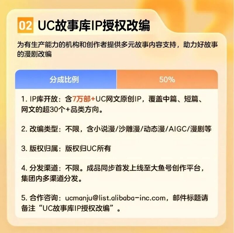 普通合作:分成比例70%,漫剧类型不限,合作数量不限、合作方要求不限;季度框架合作:分成比例达90%,漫剧类型要求不含小说漫、合作数量要求每月10部,且连续供给3个月,合作方要求需经平台评估通过。(二)UC故事库IP授权改编,该模式主要为有生产能力的机构,和创作者提供多元故事内容支持,助力好故事的漫剧改编。