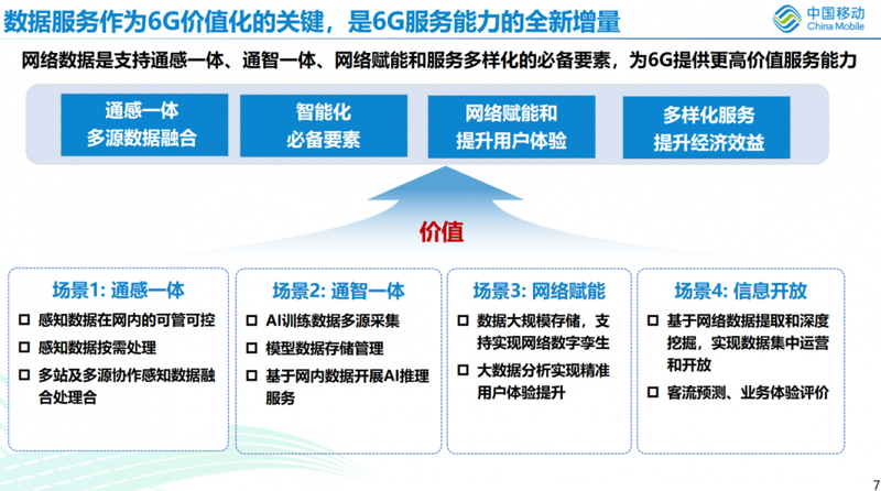 在关键能力设计层面,6大技术协同支撑、构建统一数据框架。采集源自终端、基站、核心网网络功能等的多维多类型数据,通过新协议栈提升传输效率,依托内生AI平台实现数据、算力、模型一体化编排和数据处理,采用Data Fabric与Data Mesh架构进行数据存储并降低迁移成本,进行全流程的数据闭环管理,面向网内及网外的跨域数据开放和共享。