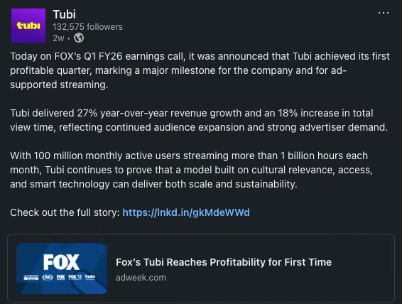 而且这不只是因为本期有 Tubi 的嘉宾——我最近在播客里也说过很多次:在 AVOD/FAST 的世界里,Tubi 常常“别人走直线、他们走之字”(当别人都走线性频道时,他们却以点播为主)。他们从“技术/内容平台”起家,再反向工程出广告与分发,这也是为什么我认为他们在 FAST 阵营里广告层面领先。而就在本周的 Fox 财报电话会上,Tubi 宣布了他们的第一个盈利季度。我觉得他们是一家“创新屋”,平台负责人 Angeli Sud(前 Vimeo)非常聪明。我确实认为他们在 AVOD 赛道上引领着创新。