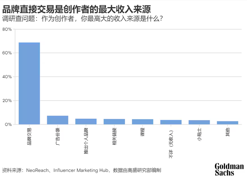 高盛研究部预计,未来五年全球5000万创作者的复合年增长率将达到10-20%。创作者的收入主要来自于网红带货的直接品牌交易、在主播平台分得的部分广告收入、以及通过订阅、打赏和来自关注者其他形式的直接支付。根据调查数据,品牌带货是收入的主要来源,约占70%。
