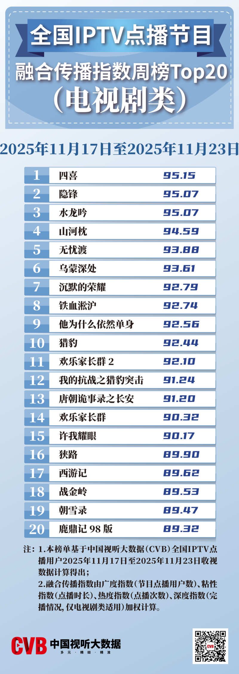全国IPTV点播节目融合传播指数周榜Top20(电视剧类)【2025年11月17日-23日】
