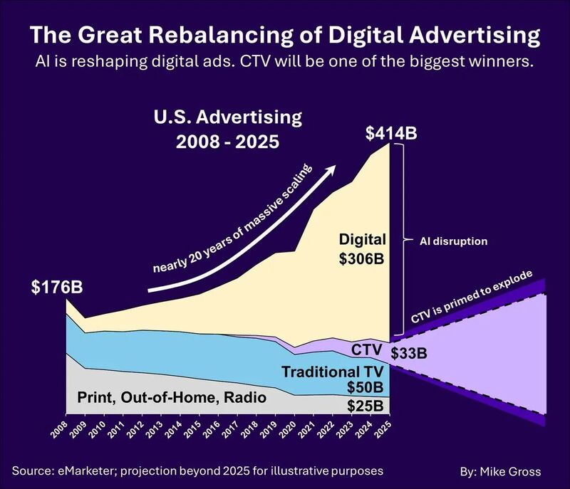 上面这张图展示了美国广告的“再平衡”:到 2025 年,数字广告占主导,CTV 高速增长,AI 加速重塑格局。