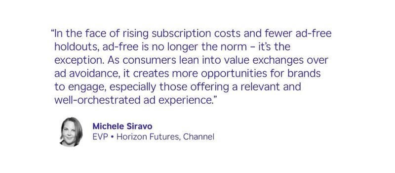 Horizon Futures, Channel 执行副总裁 Michele Siravo 表示:“面对订阅成本上升以及几乎没有无广告选项,无广告不再是常态,而是例外。随着消费者从‘回避广告’转向‘价值交换’,这为品牌创造了更多参与机会,尤其是那些提供‘相关且精心编排’广告体验的品牌。”