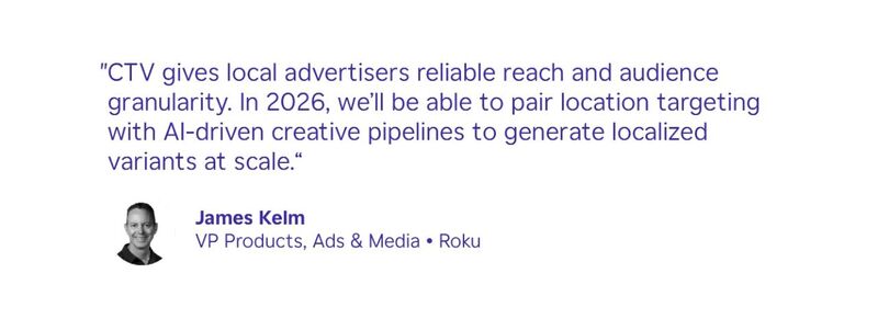 Roku 广告与媒体产品副总裁 James Kelm 表示:“CTV 为我们的本地广告主提供可靠覆盖与人群颗粒度。到 2026 年,我们将把‘县/州级定向’与 ‘AI 驱动创意管线’配对,实现大规模本地化版本生成。结果是小型广告主也能实现高效运营的战役,并具有完善的测量与快速迭代能力。”