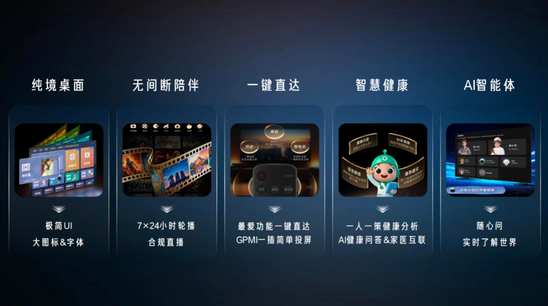 首先是极简交互设计,降低使用门槛。推出纯境桌面与极简UI,采用大图标、大字体设计,减少冗余操作步骤,让老年用户一目了然;实现最爱功能一键直达,支持GPMI一键投屏,无需复杂设置即可快速连接设备,降低操作难度;优化AI语音交互,支持方言识别,7×24小时响应,用户通过语音唤醒即可实现频道切换、功能调用。