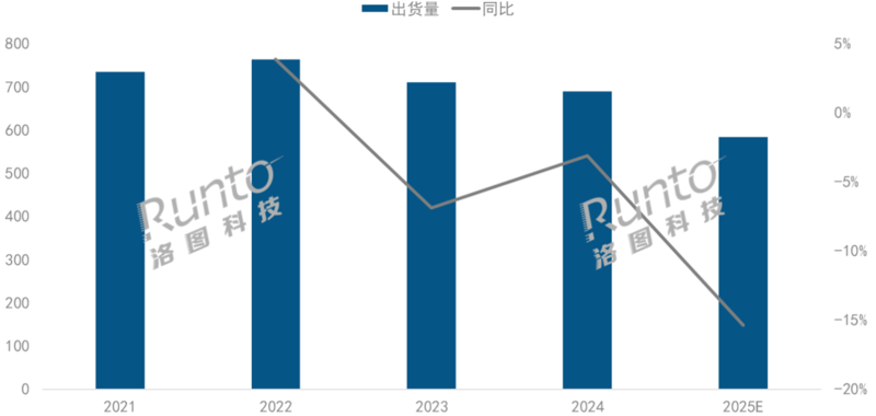 中国投影机市场在2021到2022年凭借宅经济红利实现快速增长之后,进入到了连续三年的回调期。根据洛图科技(RUNTO)数据显示,整体市场的出货量在2022年触及764万台的阶段性峰值后开始回落,2024年跌破700万台关口至689.3万台,预计2025年进一步下滑至600万台以内,为583.4万台,同比下降15.4%。