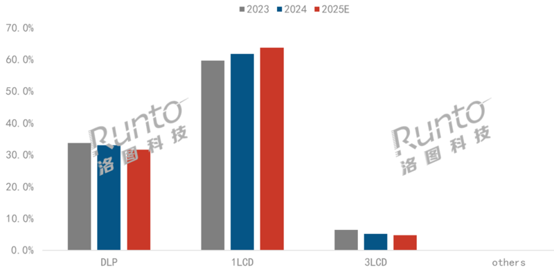1LCD 产品在技术门槛和成本方面具有优势,成为了入门级产品的主流选择,长期占据中国投影机市场的主导地位。根据洛图科技(RUNTO)数据显示,2025年,1LCD投影的出货量预计为371.5万台,同比下滑12.7%,延续多年的增长势头终止;但市场份额仍将上涨2.0个百分点至63.7%。