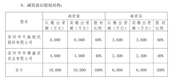 公司发布《关于对控股子公司深圳宜和股份有限公司减资的议案》,同意公司和深圳市华建盛世实业有限公司(以下简称“华建盛世”)共同对深圳宜和股份有限公司(以下简称“宜和公司”)同比例减资,其中天威视讯减资2,400万元,华建盛世减资1,600万元。减资完成后,宜和公司的注册资本将由人民币10,000万元减少至6,000万元,公司仍持有其60%股权,不会导致公司合并报表发生变化。