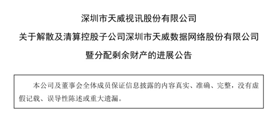 天威视讯发布《关于解散及清算控股子公司深圳市天威数据网络股份有限公司暨分配剩余财产的进展公告》,对公司决定解散及清算控股子公司深圳市天威数据网络股份有限公司(以下简称“数据公司”)予以确认,同意数据公司剩余财产的分配方案,同时授权公司管理层负责办理数据公司后期解散清算及注销的相关事宜(包括但不限于税务、工商注销及相关证照注销工作等),授权期限自董事会审议通过之日起至数据公司注销相关事宜全部办理完毕之日止。